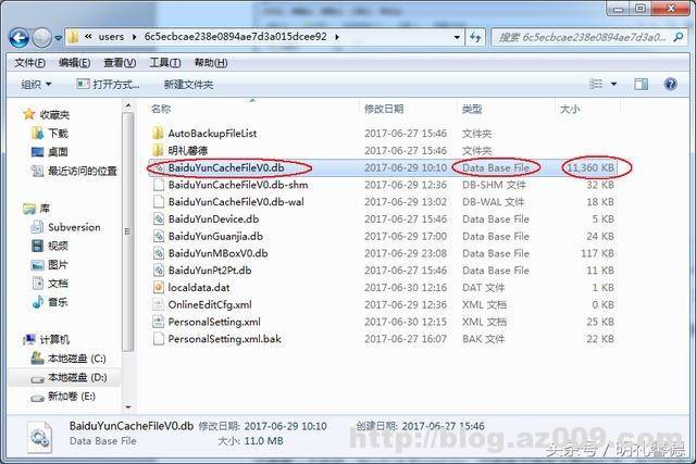 打开那个一长串的文件夹,可以看到里面有个“BaiduYunCacheFileV0.db”文件,每个人可能文件名不一样,但是后缀肯定是.db文件,然后是大小最大的那个文件,这个就是存放你网盘的详细信息的数据库了,如下图所示。